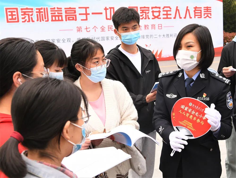 在河南农业大学开展“全民国家安全教育进校园”宣传教育活动中,郑州市公安局民警与学生们互动(2022年4月15日摄)。新华社发(刘书亭 摄)