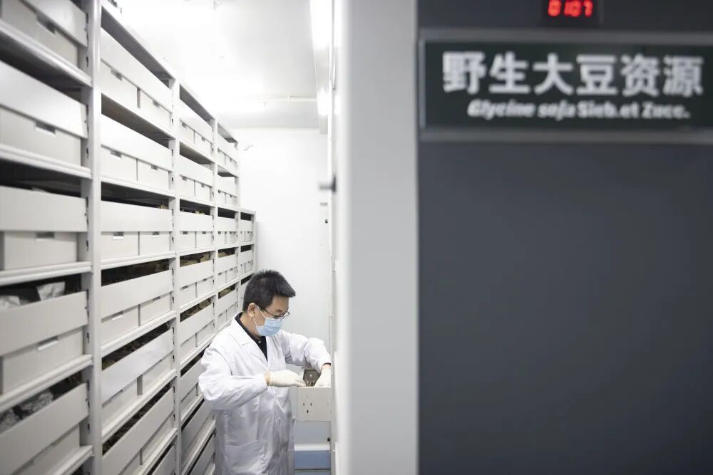工作人员在黑龙江寒地作物种质资源库内查看野生大豆种质情况(2022年5月19日摄)。新华社记者 张涛 摄