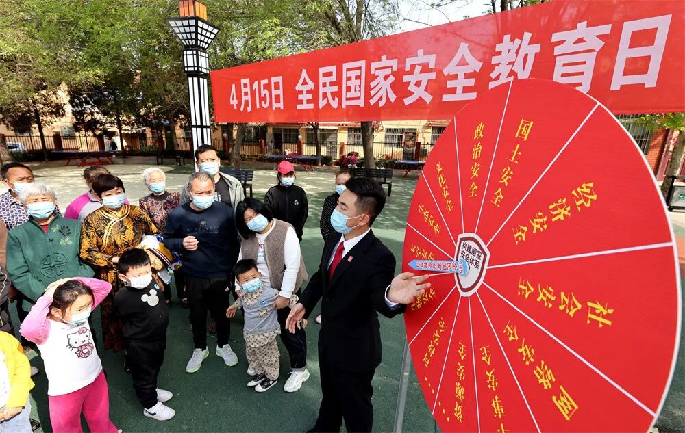 山东省枣庄市市中区人民法院工作人员在龙山路街道荣华里社区向居民讲解国家安全知识(2022年4月14日摄)。新华社发(孙中喆 摄)